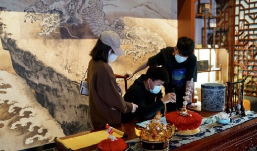 当我们一步步穿越时光隧道,跟随着指引,镇馆之宝万寿罐映入同学们的眼帘,令人惊叹的不仅是它那兼具了力量和美感的外形和油光晶亮的涂层,还有全身那九千九百九十九个不同篆刻和长寿字,象征着古代人民对长寿与永生的向往。六合太平灯笼房内,使用全息投影技术,为观众们身临其境地体验满汉全席,感受宫廷盛宴。十二生肖铜像、海晏堂、牡丹台在这里实现了中西文化的交融。3D池塘中,师生们与畅游其中的锦鲤友好互动,每踏下一步,屏幕上涟漪荡漾,引人遐想。当来到雍正皇帝的御书房中,看着一件件昂贵的黄花梨木,精雕细琢的纹理,欣赏一瓶瓶精美绝伦的瓷器,装饰周身的空间。端坐在这里,头戴皇冠,手写圣旨,让同学们切身体会到皇帝的日常起居,吃穿住行。直到陶瓷走廊,同学们在参与互动的同时,也让同学们更好的了解了瓷器的制作流程、烧制的火候掌控等中华传统技艺,学生融入其中,生动有趣,其乐无穷。